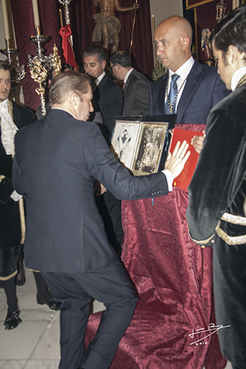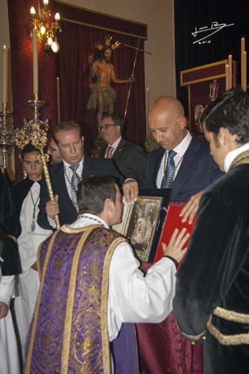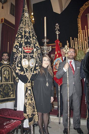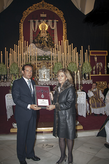 Al término de la función se entregó un cuadro conmemorativo de agradecimiento a Dª Reyes Muñiz Grijalvo por la gestión realizada que, junto a la de otras personas, ha hecho posible la consecución de las escrituras de registro de todo el edificio correspondiente a la Capilla y Casa Hermandad.