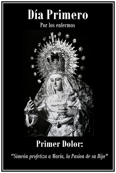 ¡Oh, Amabilísima Madre de la Soledad!, aunque me reconozco indigno de aparecer ante Vuestro acatamiento confiado a Vuestra bondad y postrado a Vuestros pies; os suplico alcancéis gracias para meditar con fruto vuestros acerbísimos Dolores. No permitáis queden malogrados tantos trabajos