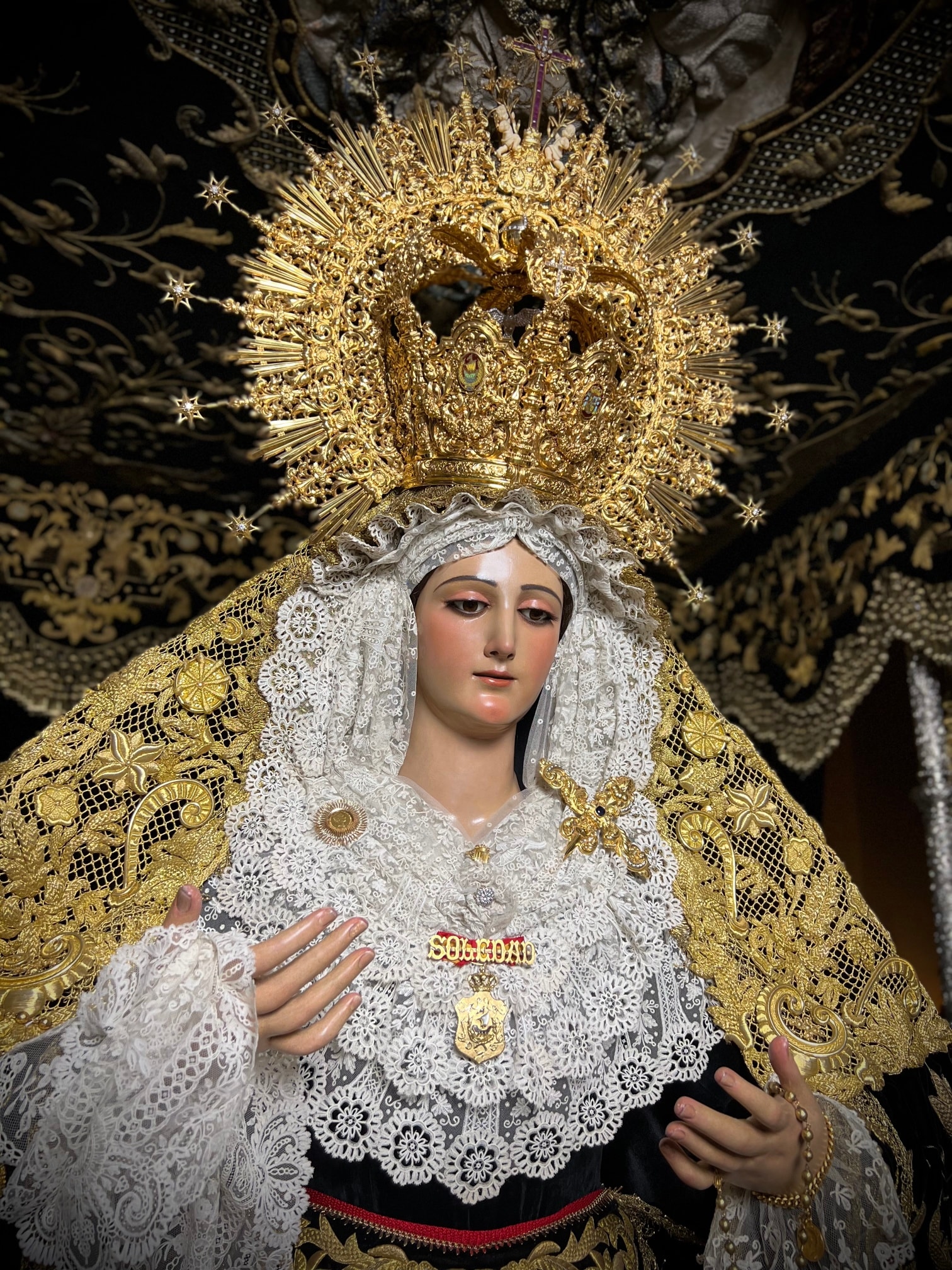 Algunos de los detalles de esta obra dignos de destacar son el puñal que atraviesa a la Señora así como el encaje de la toquilla que cubre a la Santísima Virgen, y especialmente, las manos que aparecen sosteniendo la corona, ya que una es la mano de Dª Josefa Peña, una de las mujeres más devotas de nuestra Hermandad y que hizo posible la construcción de la Residencia de Nuestra Señora de La Soledad y San José, y la otra, la de la madre del autor.