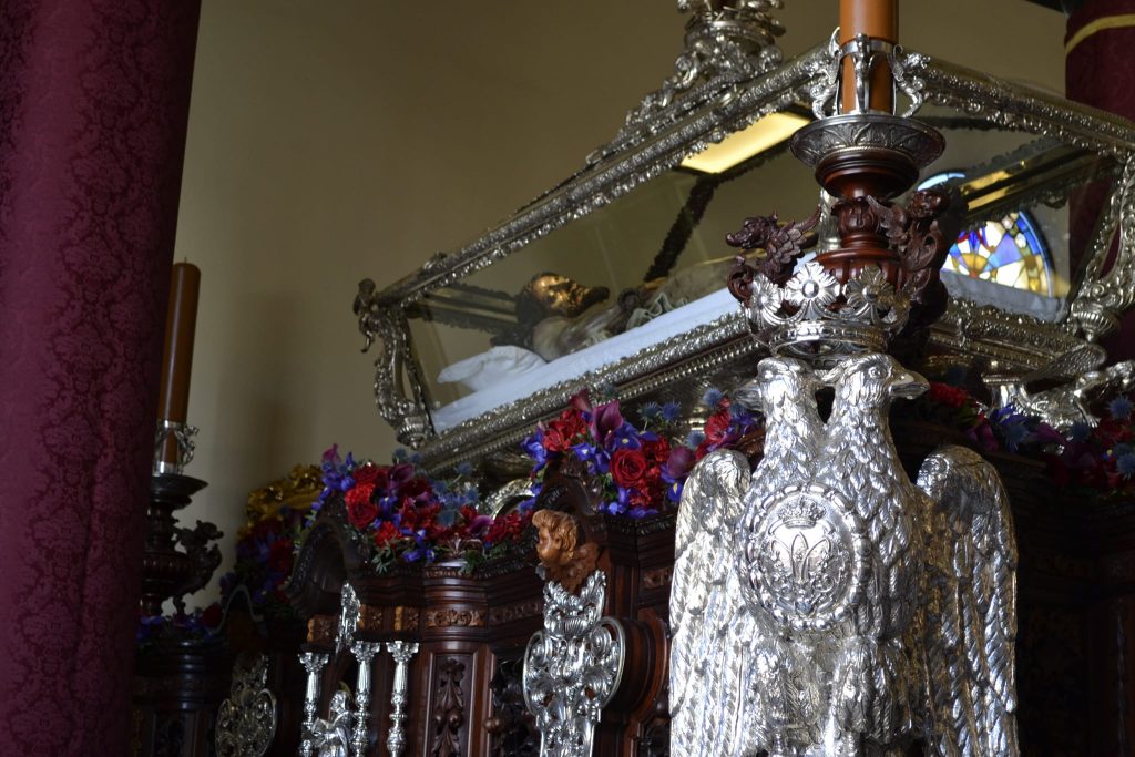 • Palio: Bordado en terciopelo negro con motivos en oro, una obra de gran riqueza visual y simbólica.